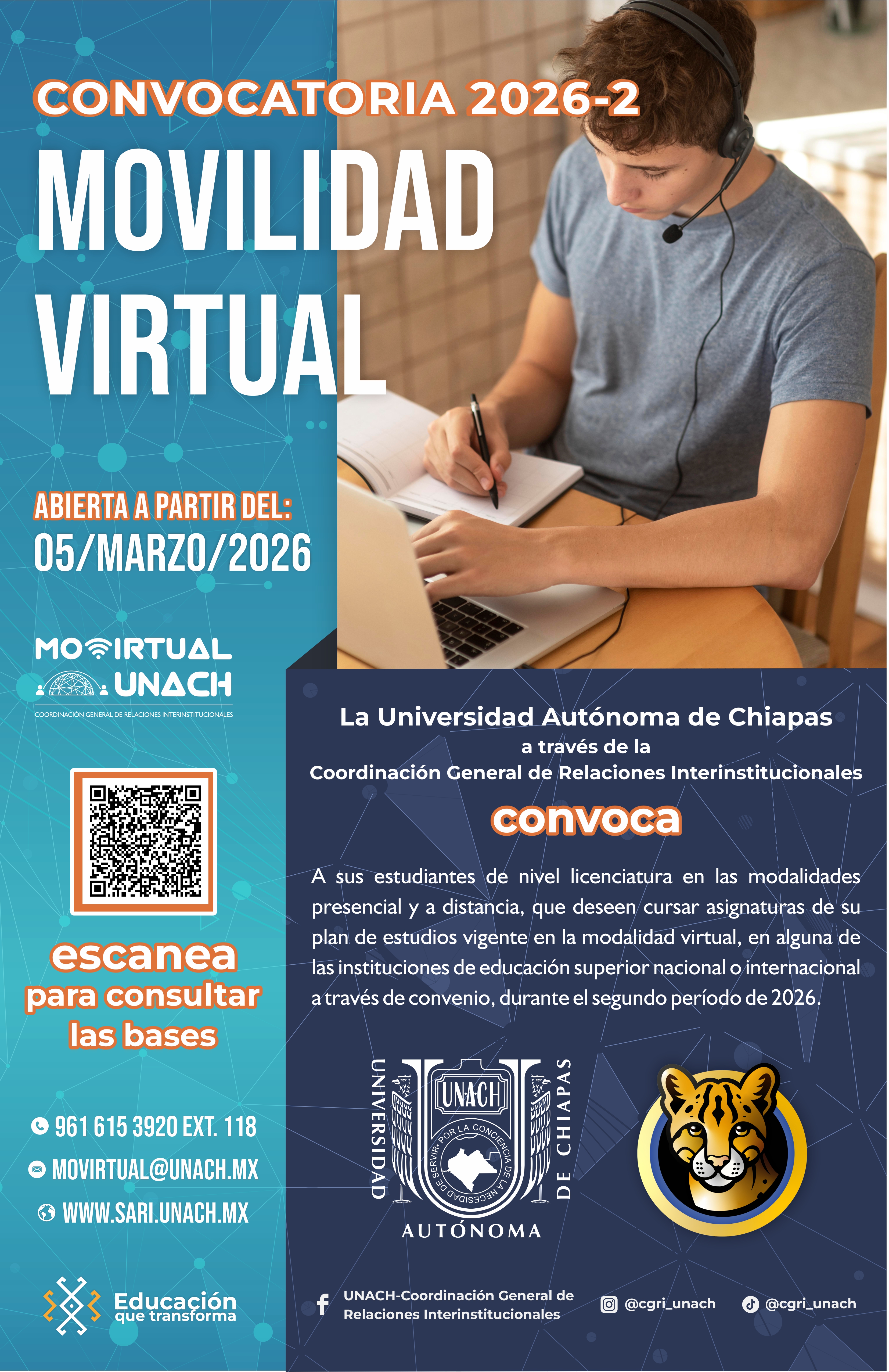 La Coordinación General de Relaciones Interinstitucionales de la UNACH lidera, coordina, promueve, fomenta y apoya la gestión y evaluación de todos los programas de Movilidad Virtual, resaltando entre sus prioridades el fortalecimiento de la actividad académica de los estudiantes de todas las facultades, y la proyección de acuerdos que enlacen a las comunidades académicas entre sí tanto en el ámbito nacional como internacional.