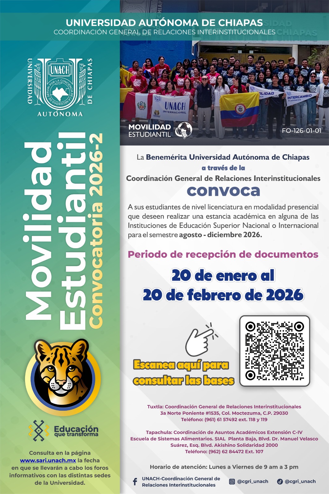 La Universidad Autónoma de Chiapas a través de la Coordinación General de Relaciones Interinstitucionales convoca a sus estudiantes de pregrado que han realizado movilidad académica a responder la encuesta para alumnos que realizaron movilidad académica 2012 – 2020.